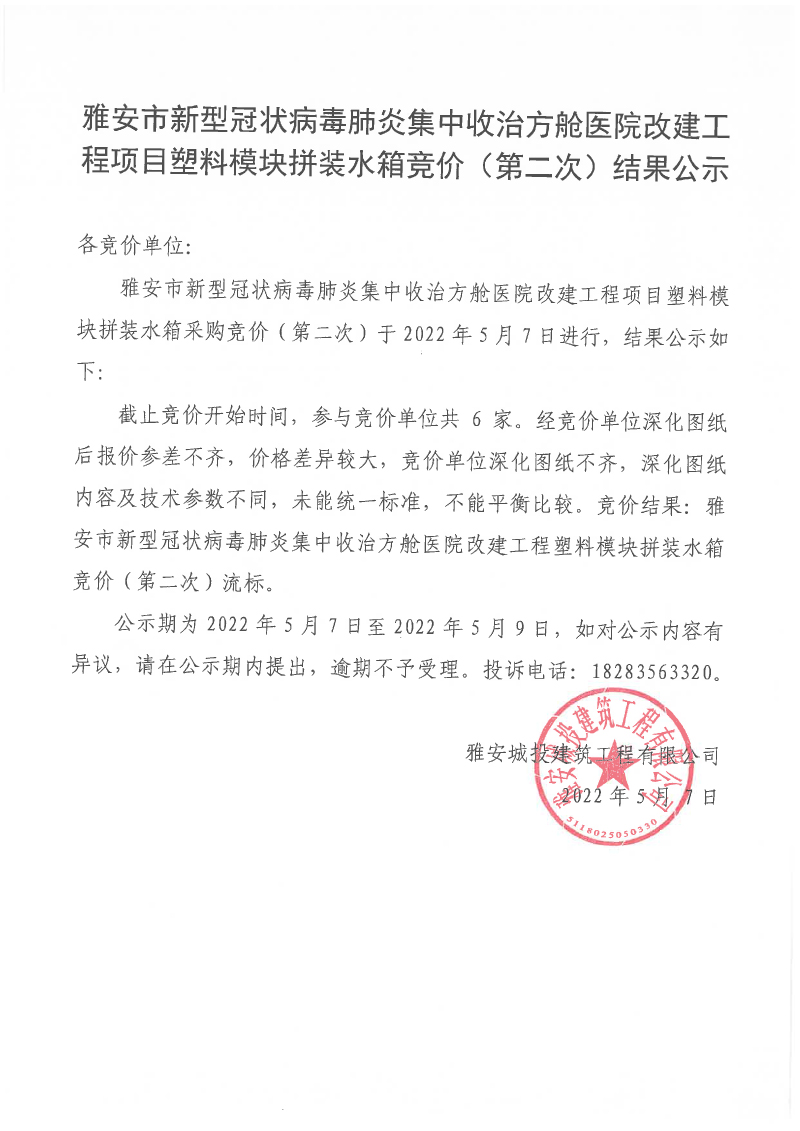 雅安市新型冠狀病毒肺炎集中收治方艙醫(yī)院改建工程項(xiàng)目塑料模塊拼裝水箱競(jìng)價(jià)(第二次)結(jié)果公示