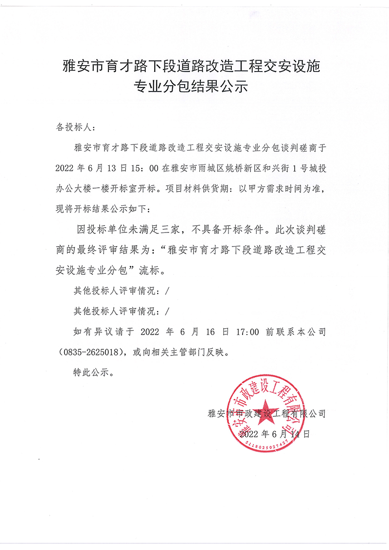 雅安市育才路下段道路改造工程交安設施專業(yè)分包結(jié)果公示