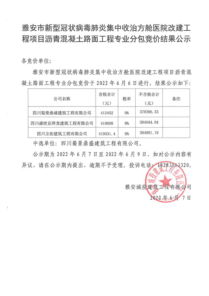 雅安市新型冠狀病毒肺炎集中收治方艙醫(yī)院改建工程項(xiàng)目瀝青混凝土路面工程專業(yè)分包競(jìng)價(jià)結(jié)果公示