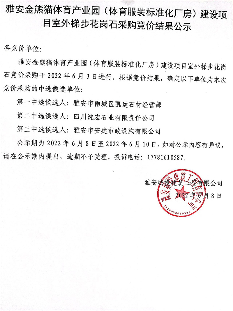 雅安市金熊貓?bào)w育產(chǎn)業(yè)園標(biāo)準(zhǔn)化廠房項(xiàng)目室外梯步花崗石采購競價(jià)結(jié)果公示