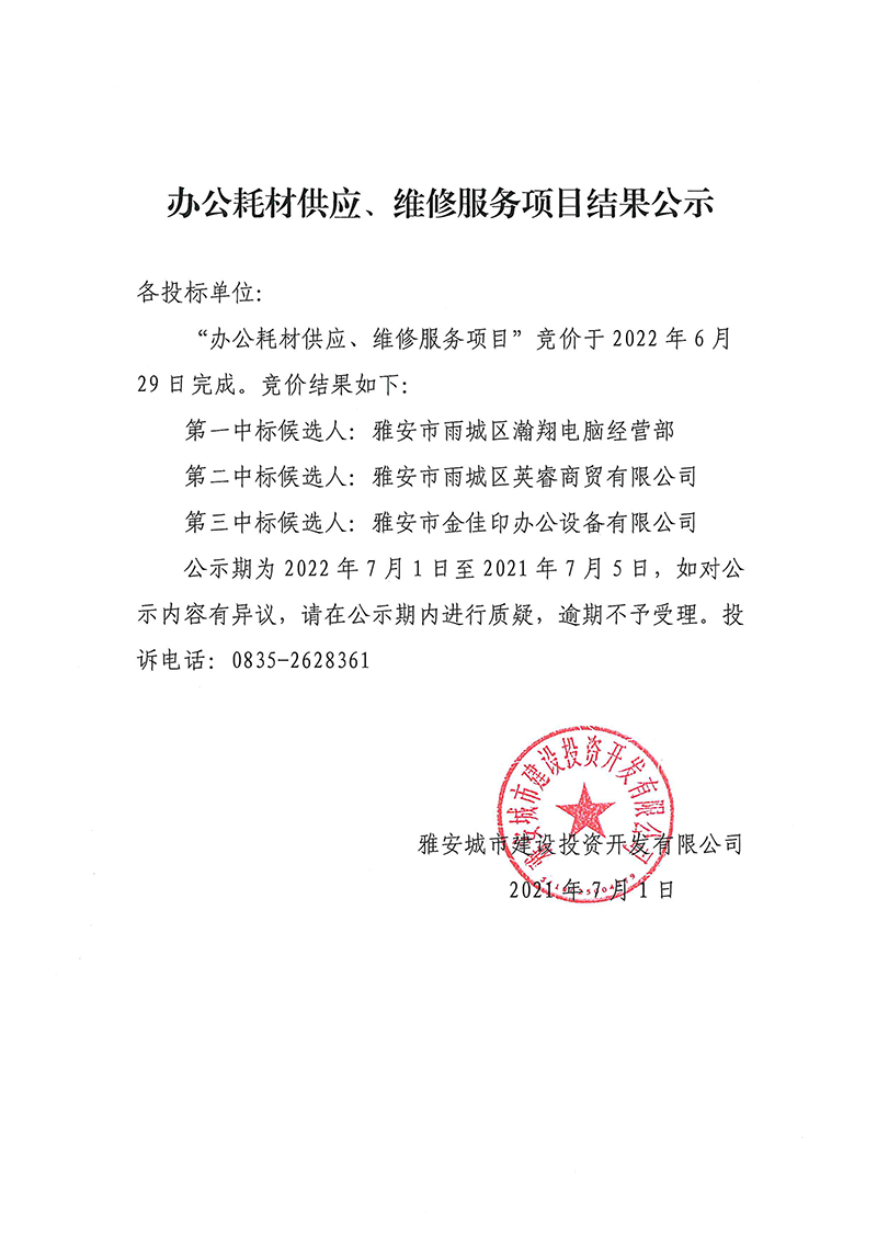 雅安城市建設(shè)投資開(kāi)發(fā)有限公司 辦公耗材供應(yīng)、維修服務(wù)項(xiàng)目采購(gòu)競(jìng)價(jià)結(jié)果公示