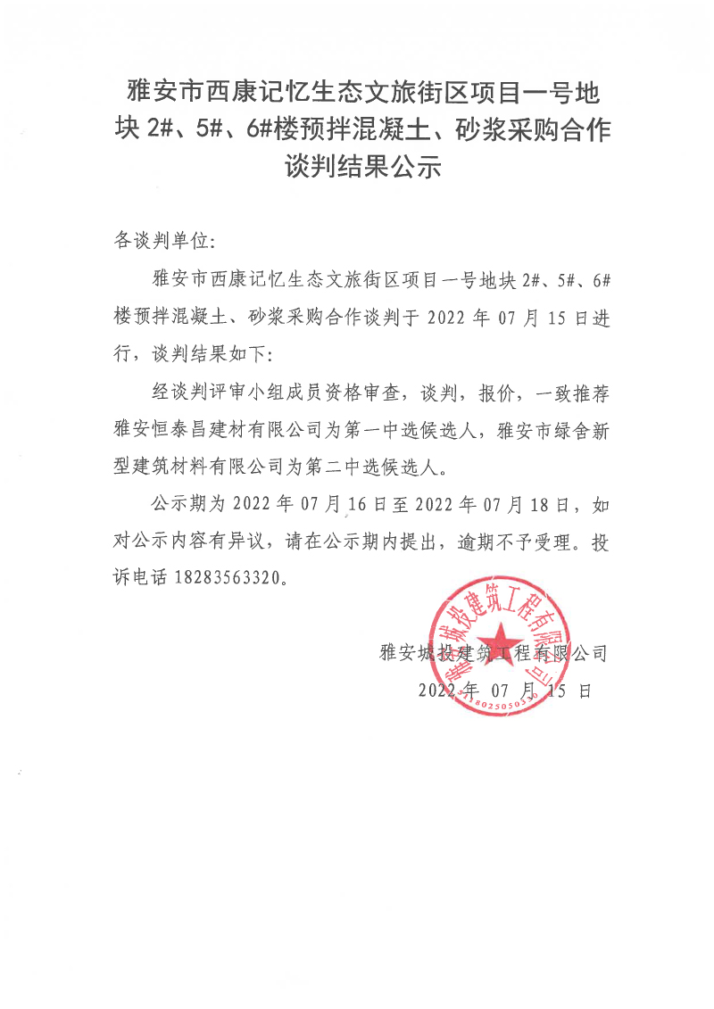 雅安市西康記憶生態(tài)文旅街區(qū)項(xiàng)目一號(hào)地塊2#、5#、6#樓預(yù)拌混凝土、砂漿采購合作談判結(jié)果公示