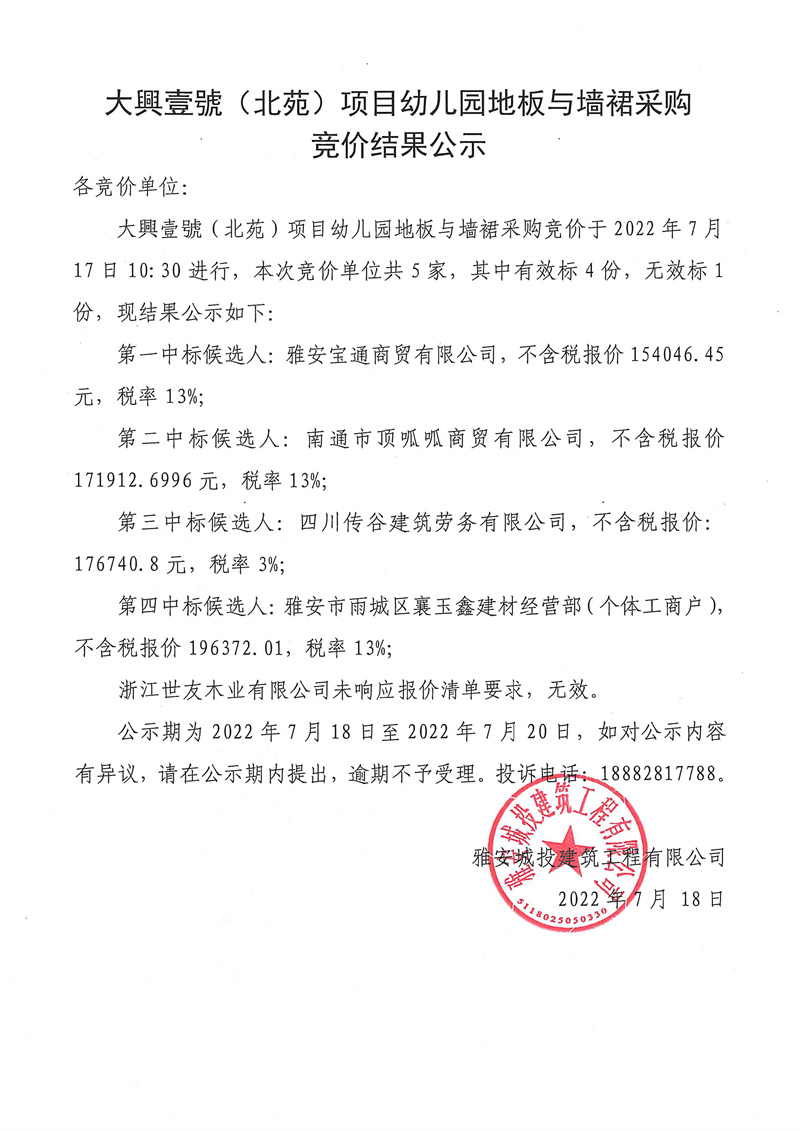 大興壹號(北苑)項目幼兒園地板與墻裙競價結(jié)果公示