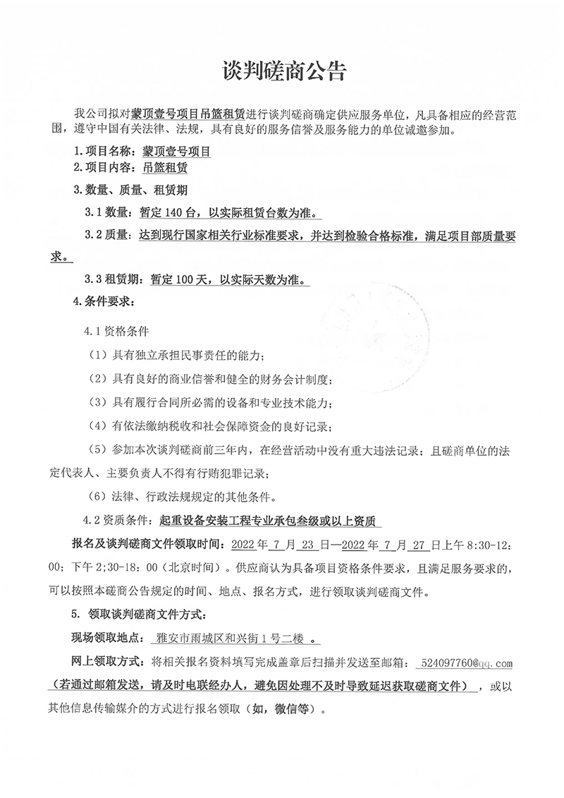 蒙頂壹號(hào)項(xiàng)目吊籃租賃談判磋商公告