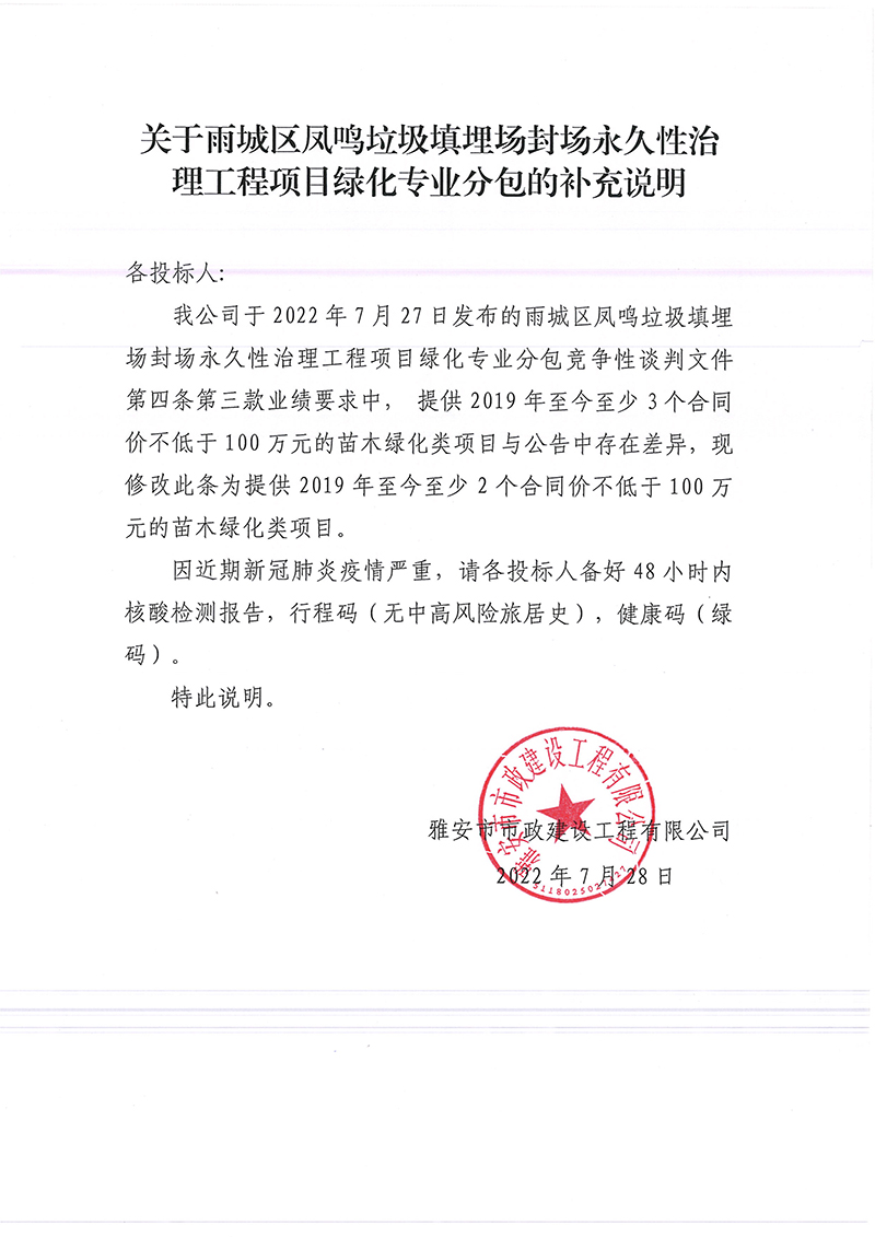 關(guān)于雨城區(qū)鳳鳴垃圾填埋場(chǎng)封場(chǎng)永久性治理工程項(xiàng)目綠化專業(yè)分包的補(bǔ)充說明