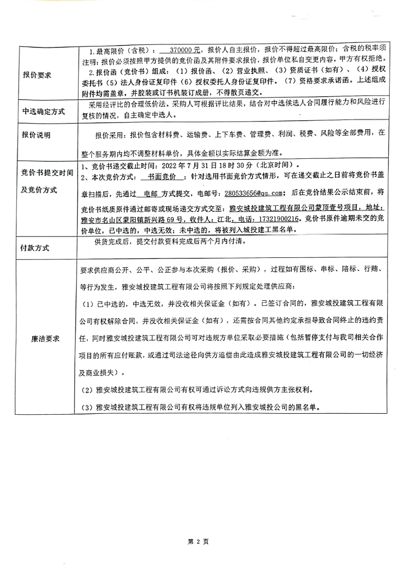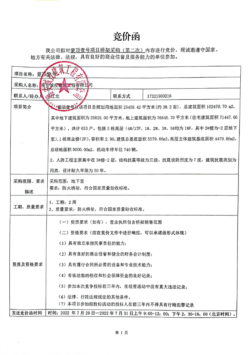 蒙頂壹號(hào)項(xiàng)目橋架采購(第二次)競(jìng)價(jià)公告