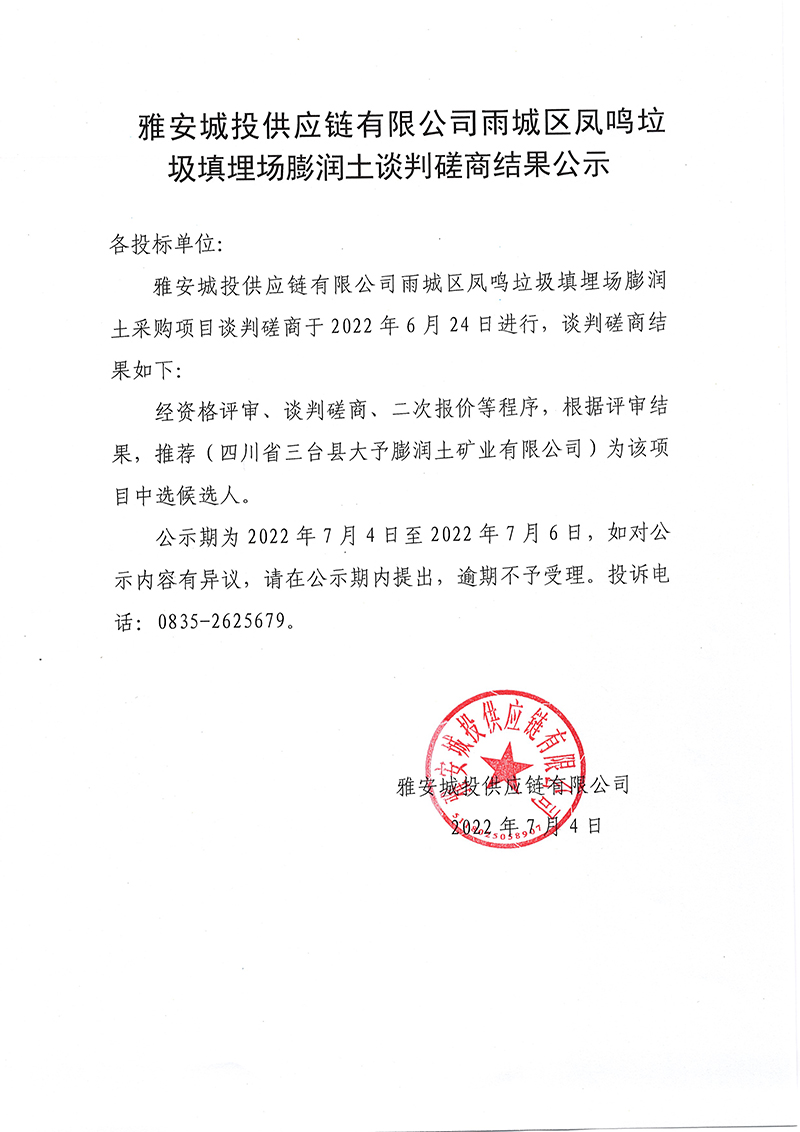 雅安城投供應(yīng)鏈有限公司雨城區(qū)鳳鳴垃圾填埋場封場永久性治理工程項(xiàng)目鈉基膨潤土談判磋商結(jié)果公示