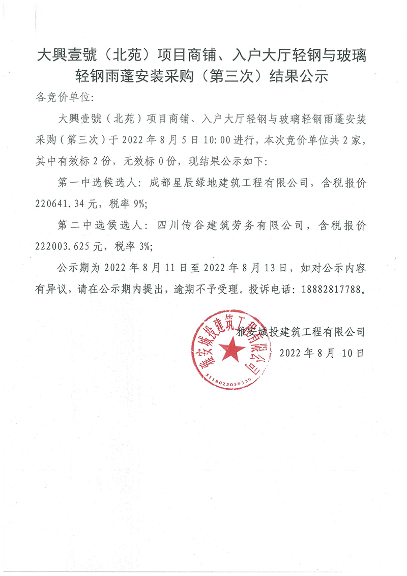 大興壹號(hào)(北苑)項(xiàng)目商鋪、入戶(hù)大廳輕鋼與玻璃輕鋼雨蓬安裝采購(gòu)(第三次)結(jié)果公示