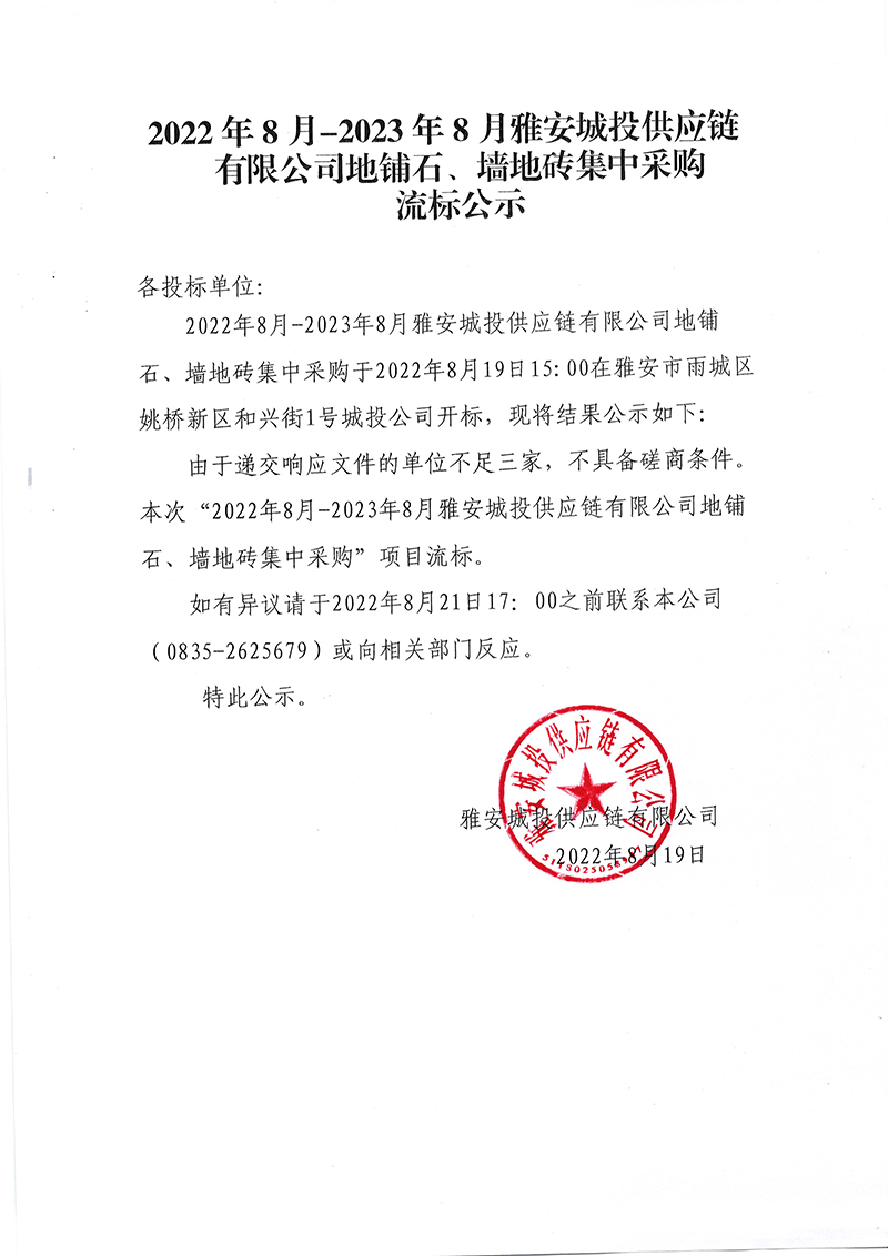 2022年8月-2023年8月雅安城投供應(yīng)鏈有限公司地鋪石、墻地磚集中采購流標公示