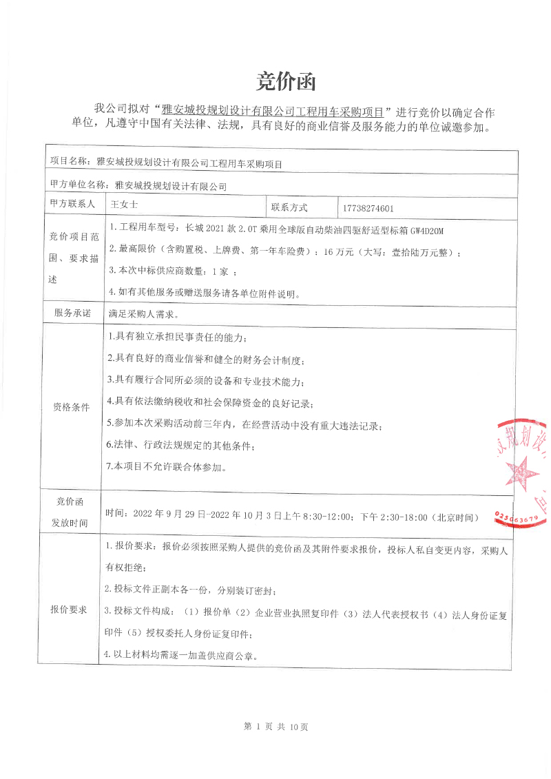 雅安城投規(guī)劃設(shè)計(jì)有限公司工程用車采購(gòu)項(xiàng)目競(jìng)價(jià)公告
