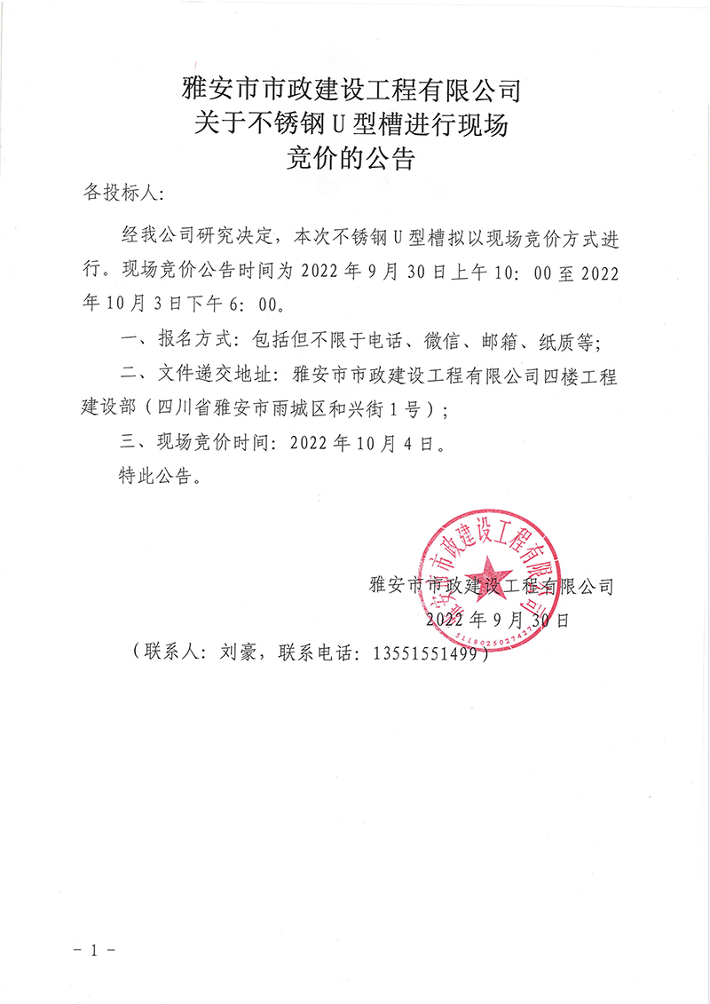 關(guān)于不銹鋼U型槽進(jìn)行現(xiàn)場競價的公告