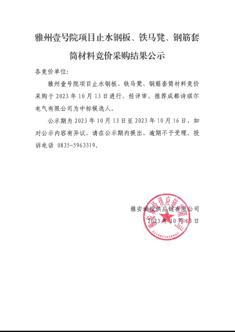 雅州壹號院項(xiàng)目止水鋼板、鐵馬凳、鋼筋套筒材料競價(jià)采購結(jié)果公示