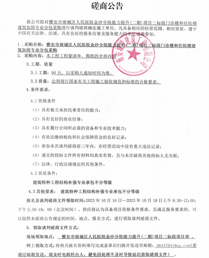 雅安市雨城區(qū)人民醫(yī)院金沙分院能力提升(二期)項目二標段門診樓和住院樓建筑加固專業(yè)分包采購談判磋商公告