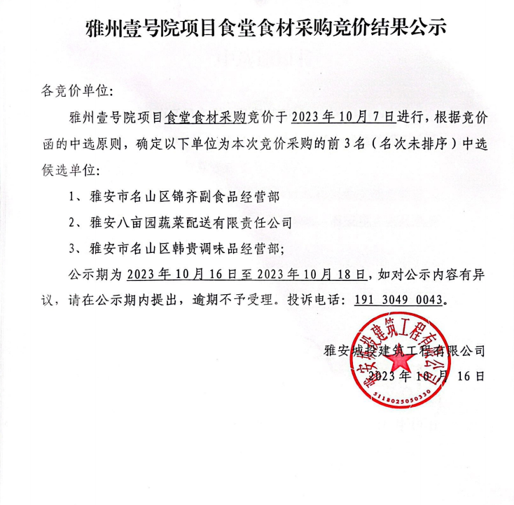 雅州壹號(hào)院項(xiàng)目食堂食材采購(gòu)競(jìng)價(jià)結(jié)果公示