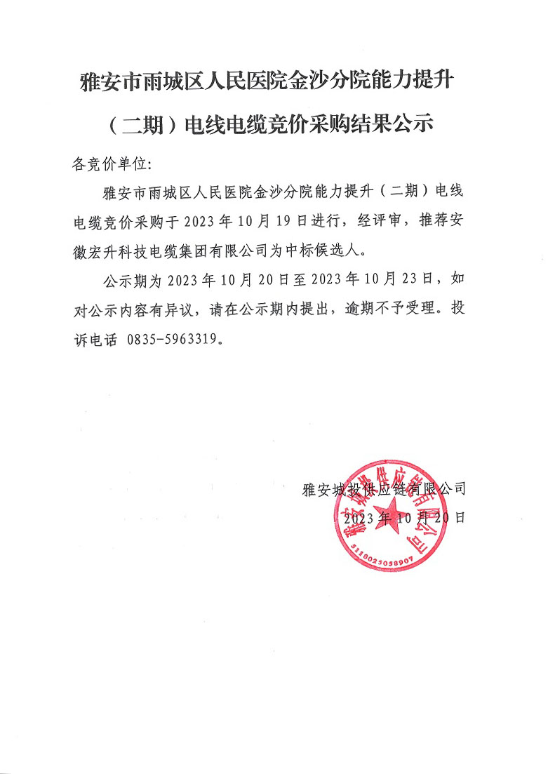 雅安市雨城區(qū)人民醫(yī)院金沙分院能力提升(二期)電線電纜競(jìng)價(jià)采購(gòu)結(jié)果公示