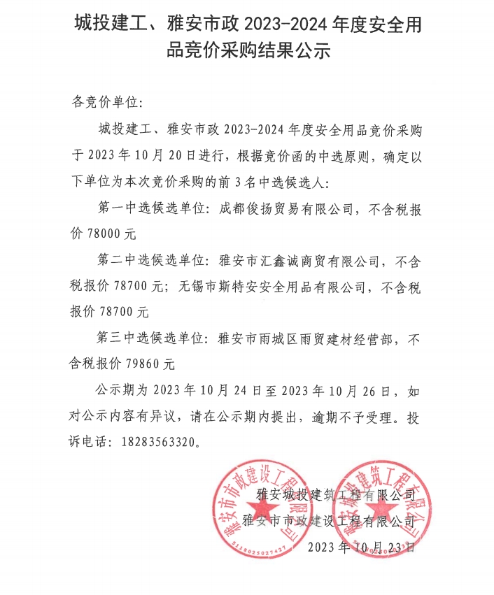 城投建工、雅安市政2023-2024年度安全用品采購結(jié)果公示