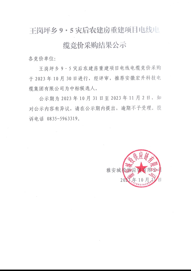 王崗坪鄉(xiāng)9.5災后農建房重建項目電線電纜競價采購結果公示