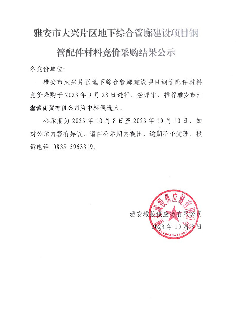 雅安市大興片區(qū)地下綜合管廊建設(shè)項(xiàng)目鋼管配件材料競價采購結(jié)果公示