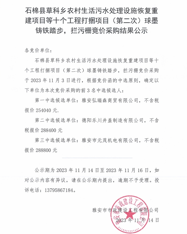 石棉縣草科鄉(xiāng)農(nóng)村生活污水處理設(shè)施恢復(fù)重建項(xiàng)目等十個(gè)工程打捆項(xiàng)目(第二次)球墨鑄鐵踏步,攔污柵競(jìng)價(jià)采購(gòu)結(jié)果公示