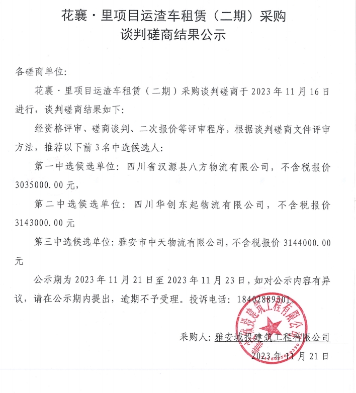 花襄·里項目運渣車租賃(二期)采購談判磋商結果公示