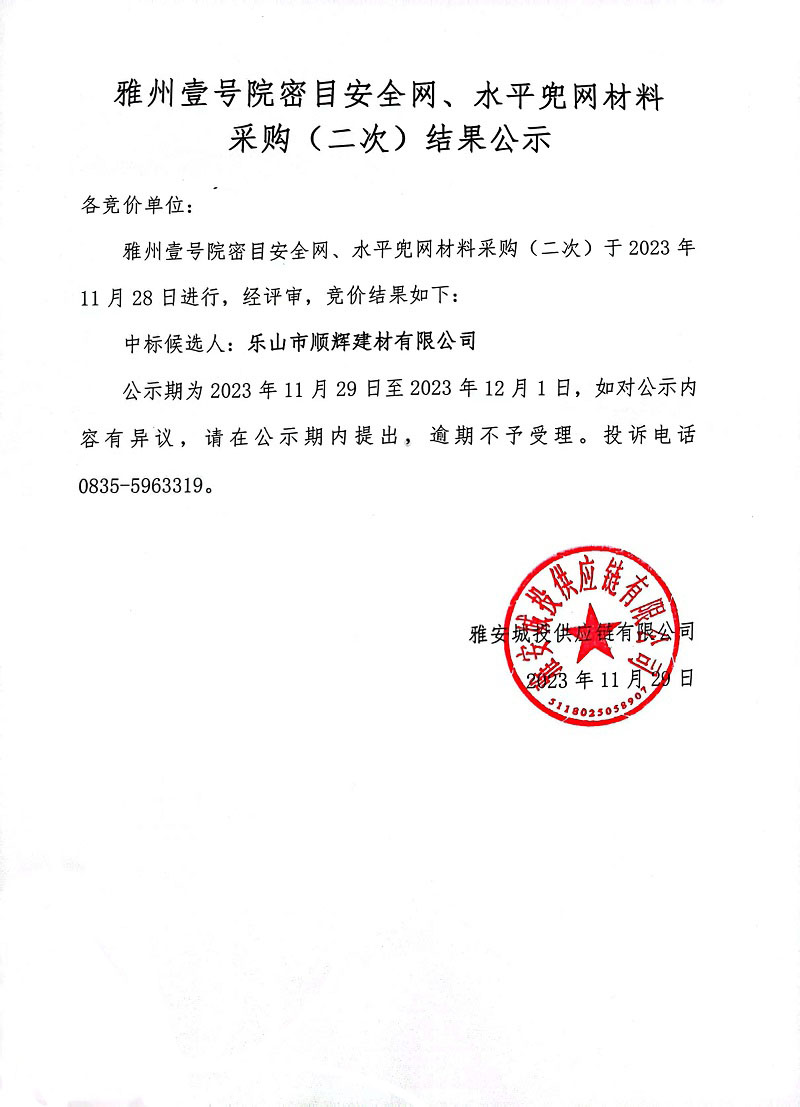 雅州壹號院密目安全網(wǎng)、水平兜網(wǎng)材料采購(二次)結果公示