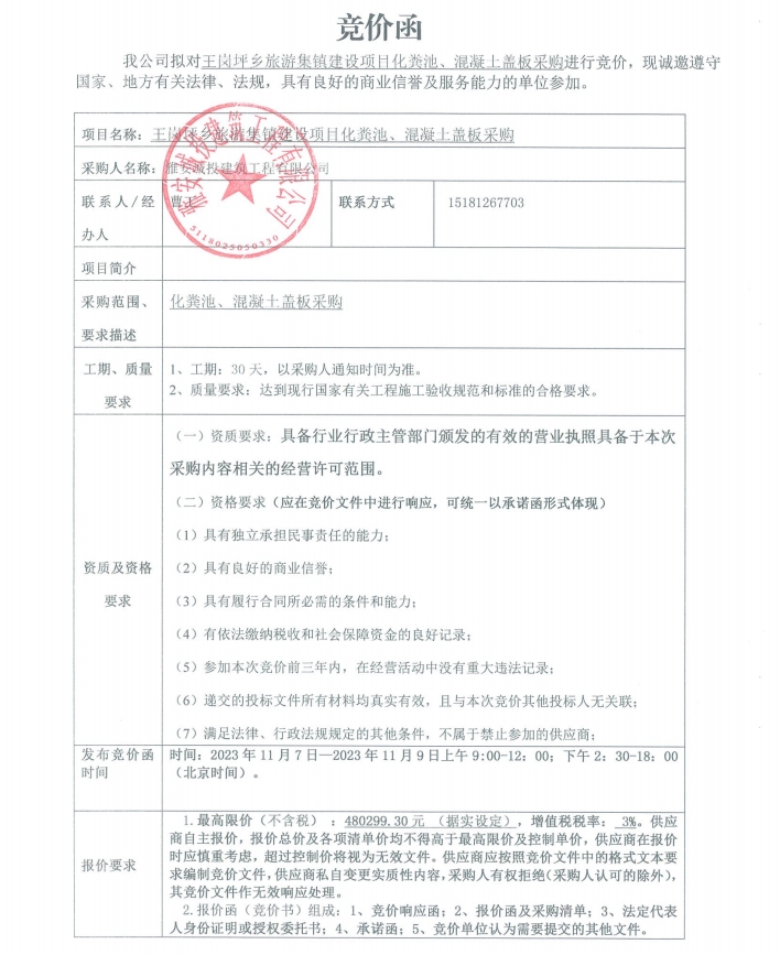 王崗坪鄉(xiāng)旅游集鎮(zhèn)建設(shè)項目化糞池、混凝土蓋板采購競價公告