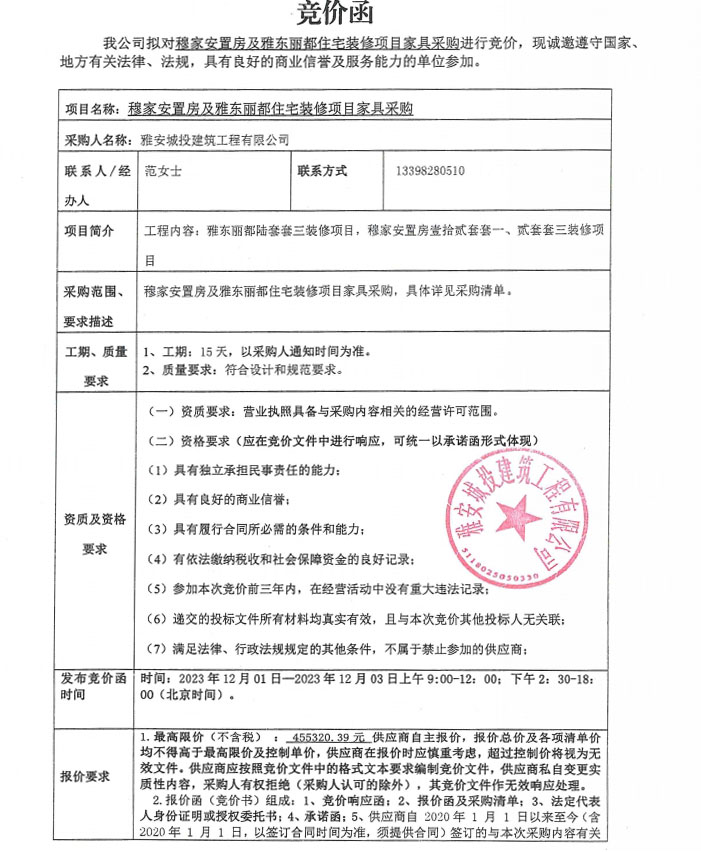 穆家安置房及雅東麗都住宅裝修項(xiàng)目家具采購(gòu)競(jìng)價(jià)公告