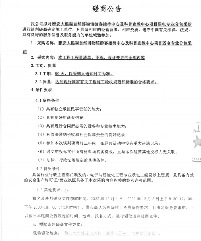 雅安大熊貓自然博物館游客接待中心及科普宣教中心項目弱電專業(yè)分包采購談判磋商公告