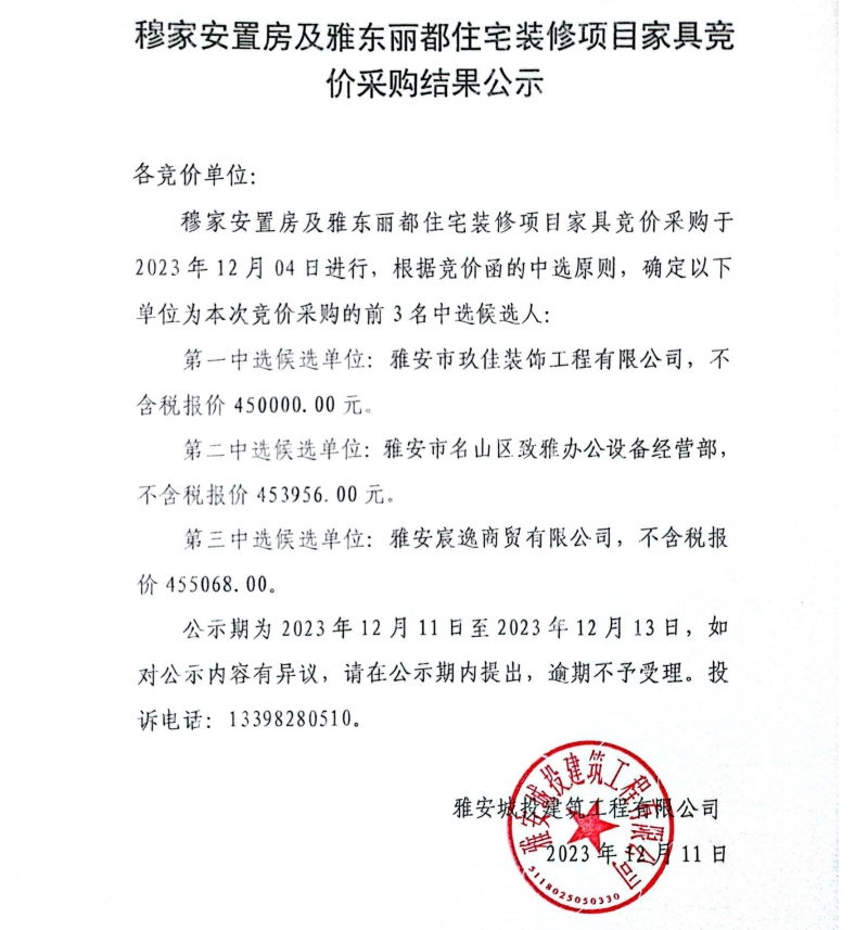 穆家安置房及雅東麗都住宅裝修項(xiàng)目家具采購競(jìng)價(jià)采購結(jié)果公示