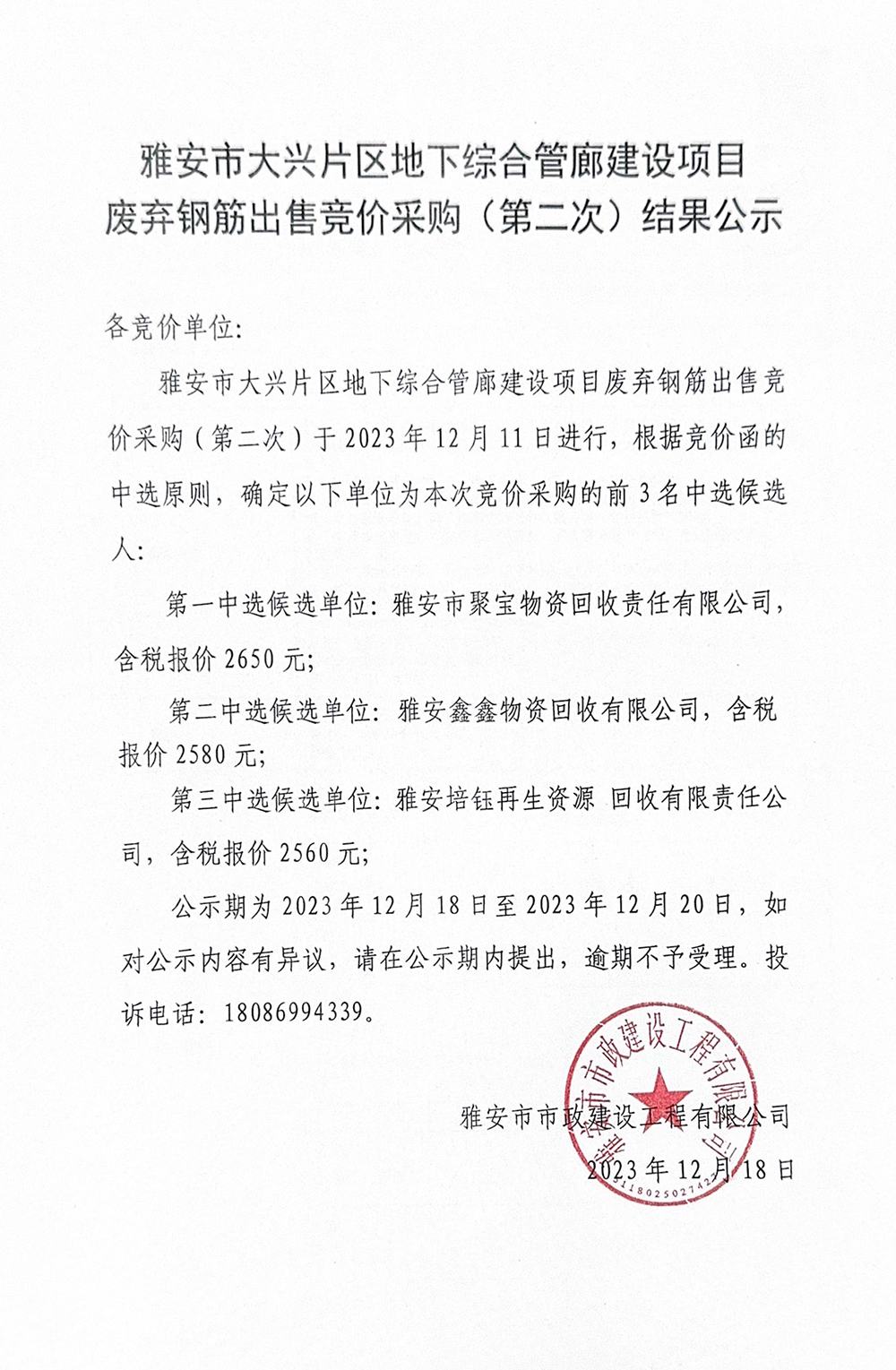 雅安市大興片區(qū)地下綜合管廊建設項目廢棄鋼筋出售競價采購(第二次)結果公示