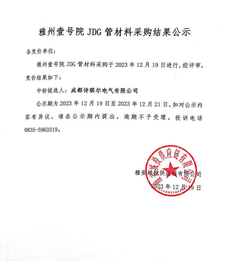 雅州壹號(hào)院JDG管材料采購(gòu)結(jié)果公示