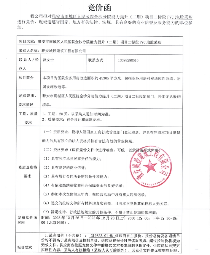 雅安市雨城區(qū)人民醫(yī)院金沙分院能力提升(二期)項(xiàng)目二標(biāo)段PVC地膠采購競價公告
