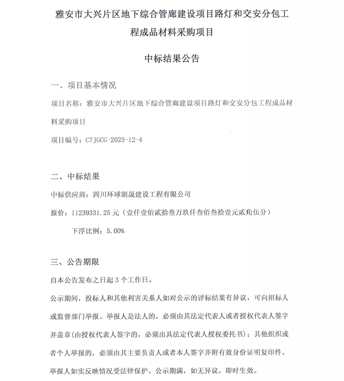 雅安市大興片區(qū)地下綜合管廊建設(shè)項(xiàng)目路燈和交安分包工程成品材料采購項(xiàng)目中標(biāo)結(jié)果公告