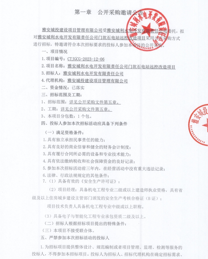雅安城利水電開發(fā)有限責(zé)任公司門坎石電站遠(yuǎn)控改造項(xiàng)目公開采購邀請(qǐng)公告
