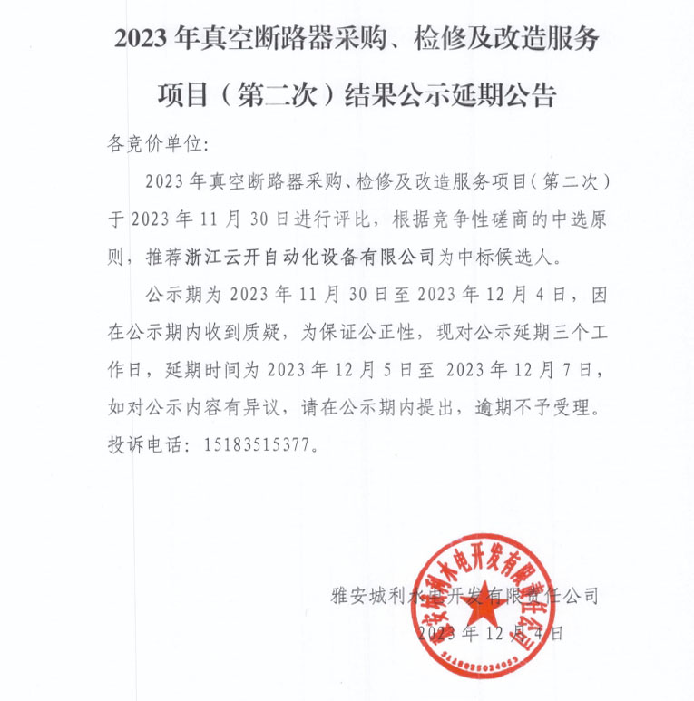2023年真空斷路器采購、檢修及改造服務(wù)項目(第二次)結(jié)果公示延期公告