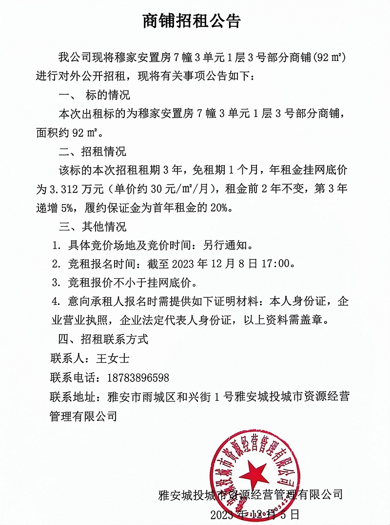 穆家安置房7幢3單元1層3號(hào)部分商鋪招租公告