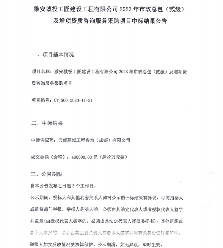 雅安城投工匠建設(shè)工程有限公司2023年市政總包(貳級(jí))及增項(xiàng)資質(zhì)咨詢服務(wù)采購項(xiàng)目中標(biāo)結(jié)果公告