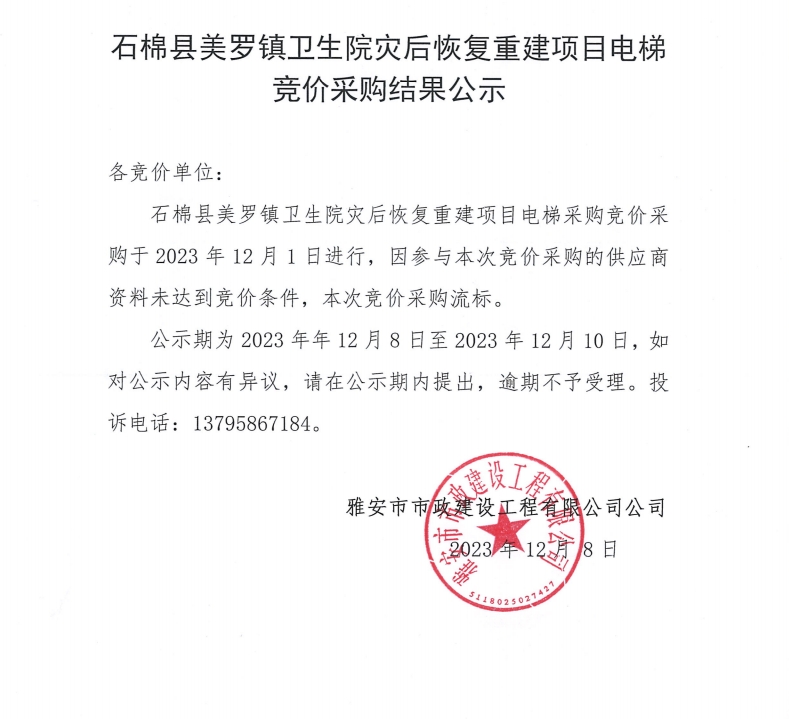 石棉縣美羅鎮(zhèn)衛(wèi)生院災(zāi)后恢復(fù)重建項目電梯競價采購結(jié)果公示