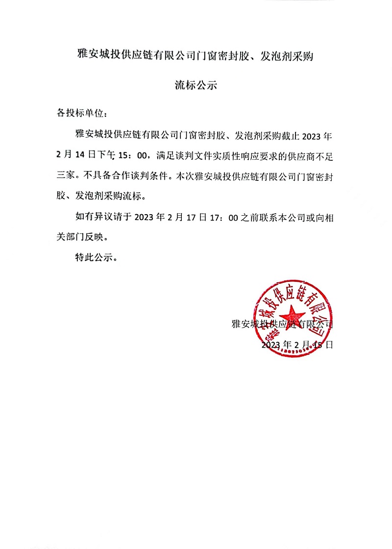 雅安城投供應(yīng)鏈有限公司門窗密封膠、發(fā)泡劑采購流標公示