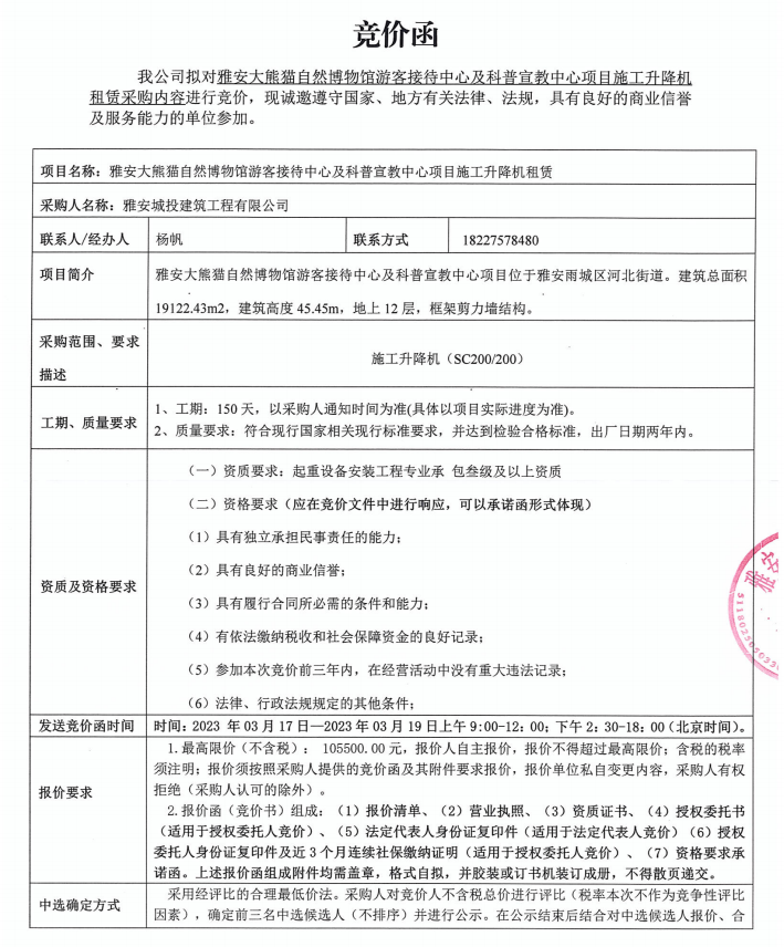 雅安大熊貓自然博物館游客接待中心及科普宣教中心項(xiàng)目施工升降機(jī)租賃采購(gòu)競(jìng)價(jià)公告