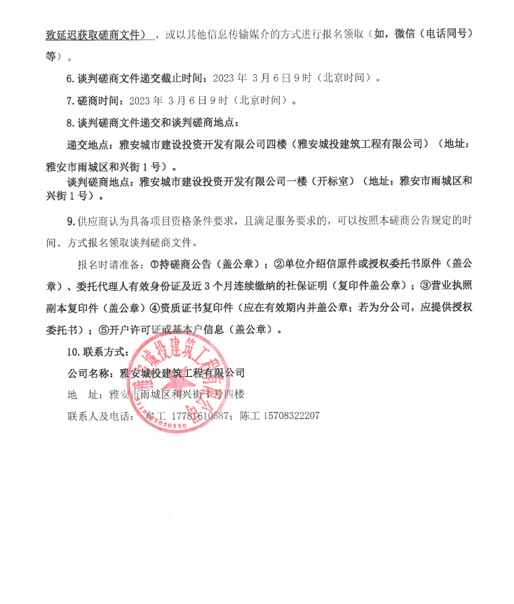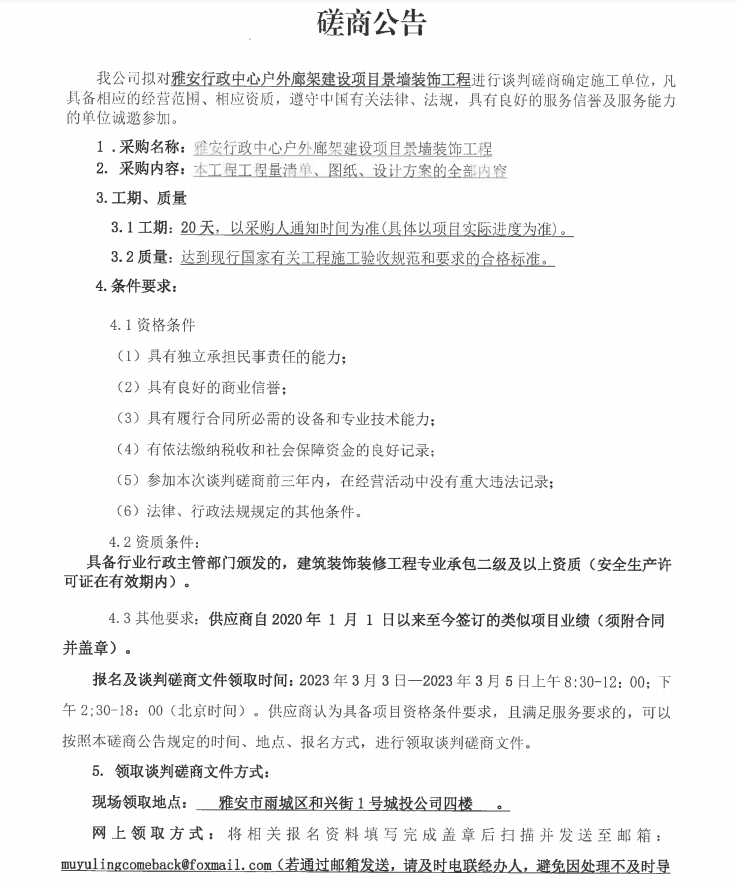 雅安行政中心戶外廊架建設項目景墻裝飾工程談判磋商公告