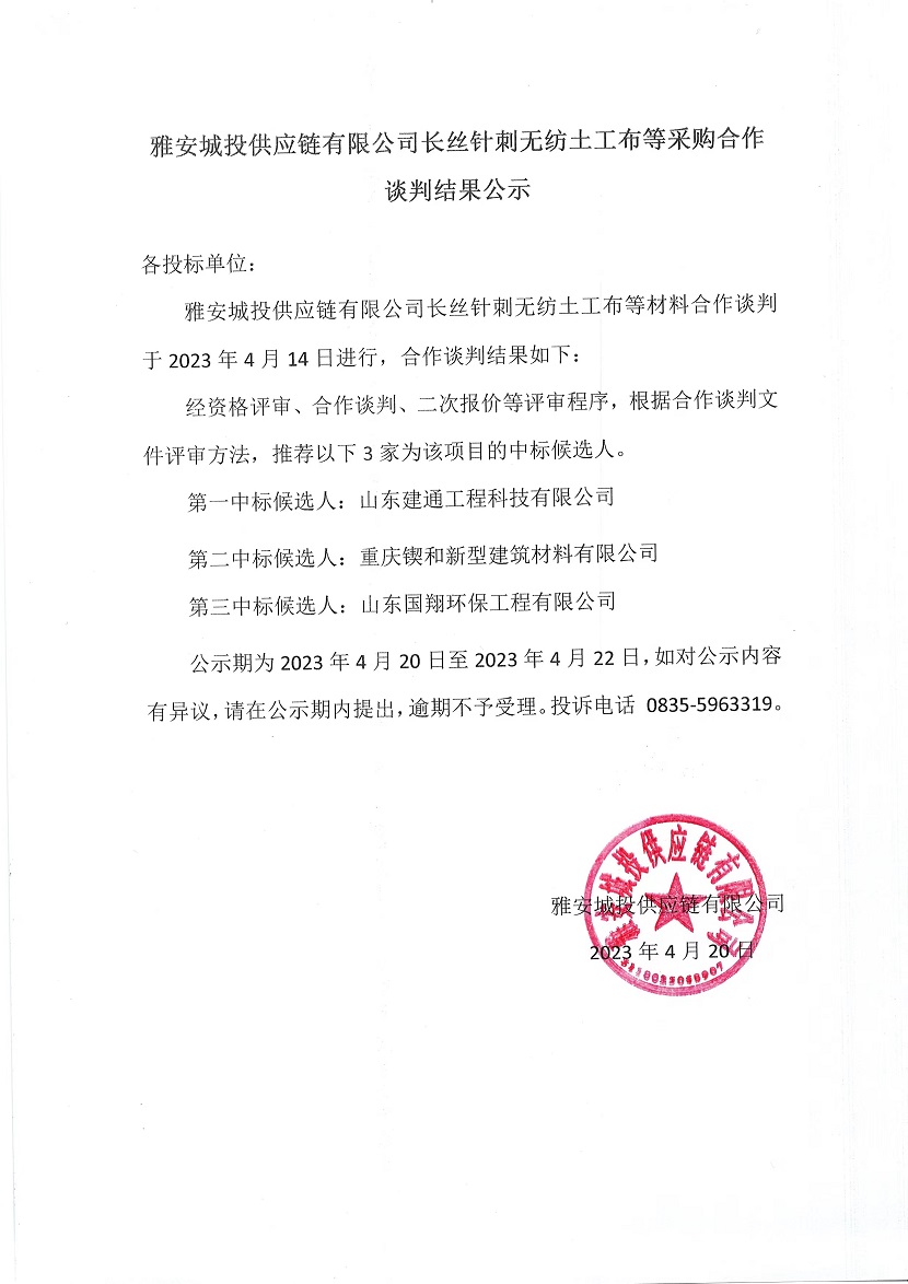 雅安城投供應鏈有限公司長絲針刺無紡土工布等采購合作談判結(jié)果公示