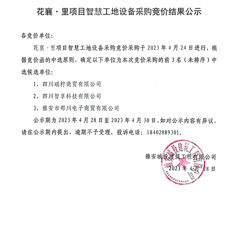 花襄·里項(xiàng)目智慧工地設(shè)備采購競價結(jié)果公示