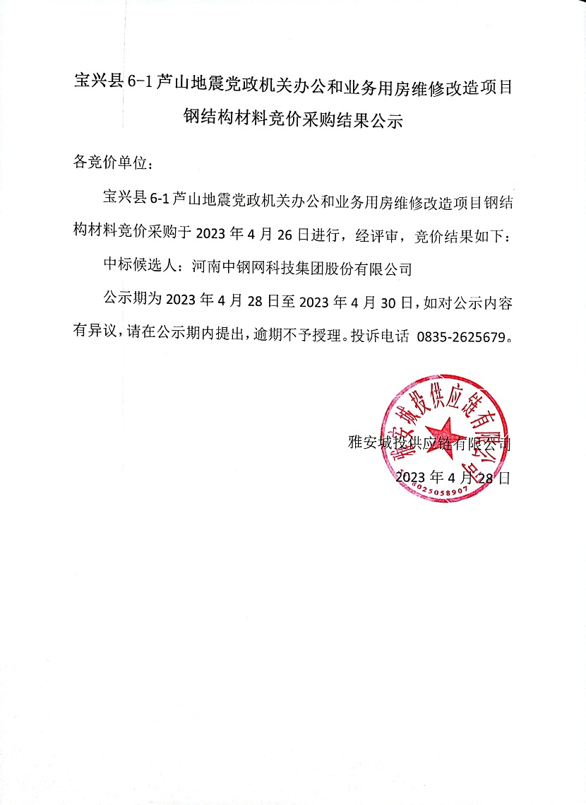 寶興縣6-1蘆山地震黨政機關(guān)辦公和業(yè)務(wù)用房維修改造項目鋼結(jié)構(gòu)材料競價采購結(jié)果公示