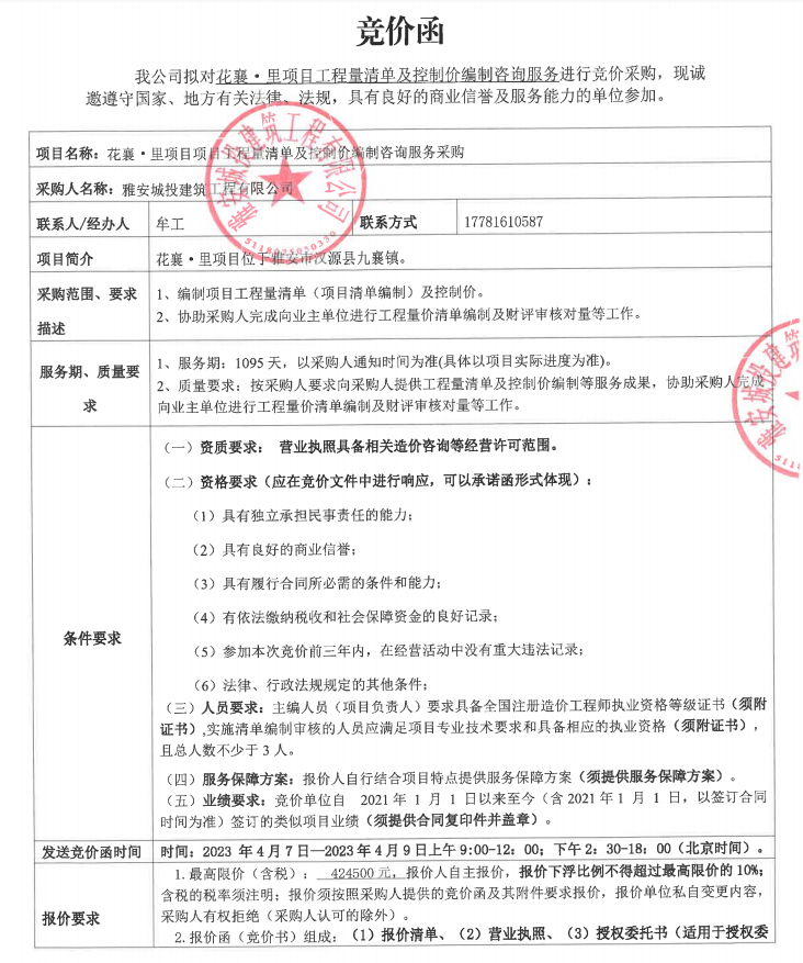 花襄·里項目工程量清單及招標控制價編制咨詢服務采購競價公告