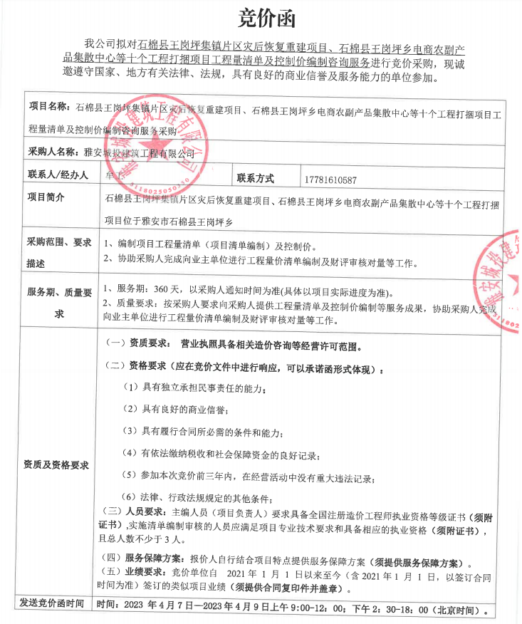 王崗坪集鎮(zhèn)項(xiàng)目、王崗坪集散中心打捆項(xiàng)目工程量清單及控制價(jià)編制咨詢服務(wù)采購(gòu)競(jìng)價(jià)公告