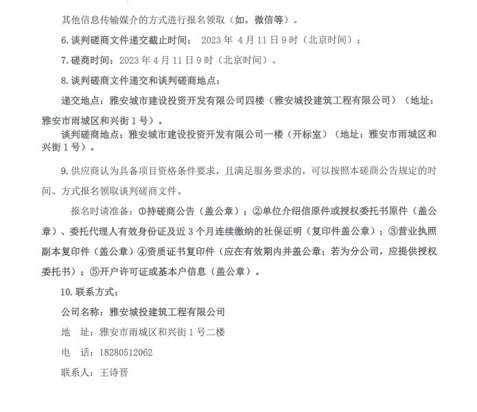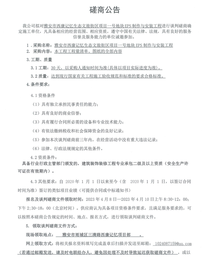雅安市西康記憶生態(tài)文旅街區(qū)項(xiàng)目一號地塊項(xiàng)目EPS制作與安裝工程采購談判磋商公告