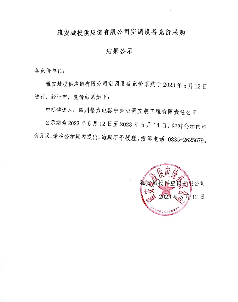 雅安城投供應(yīng)鏈有限公司空調(diào)設(shè)備競價(jià)采購結(jié)果公示