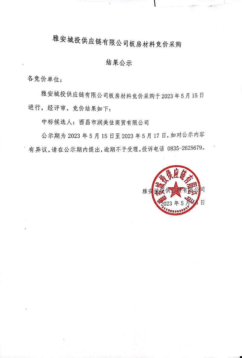 雅安城投供應鏈有限公司板房材料競價采購結果公示