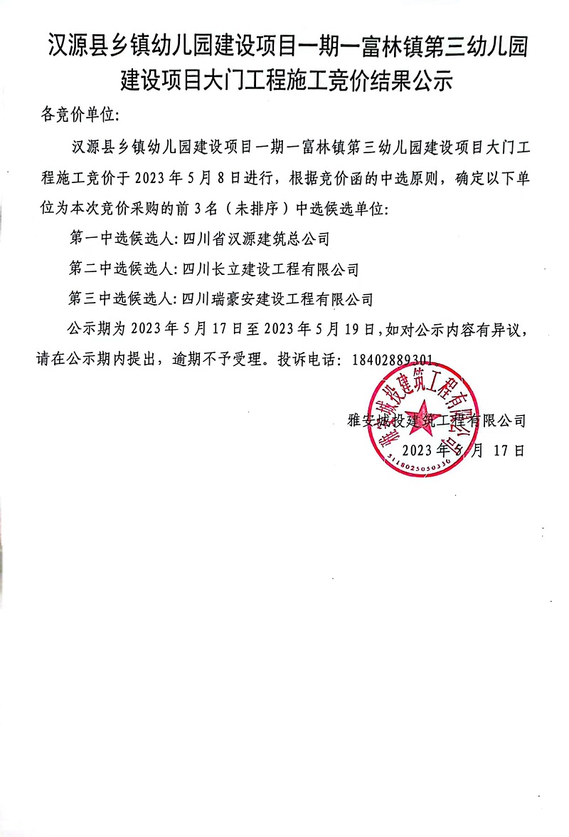 漢源縣鄉(xiāng)鎮(zhèn)幼兒園建設(shè)項目一期一富林鎮(zhèn)第三幼兒園建設(shè)項目大門工程施工競價結(jié)果公示